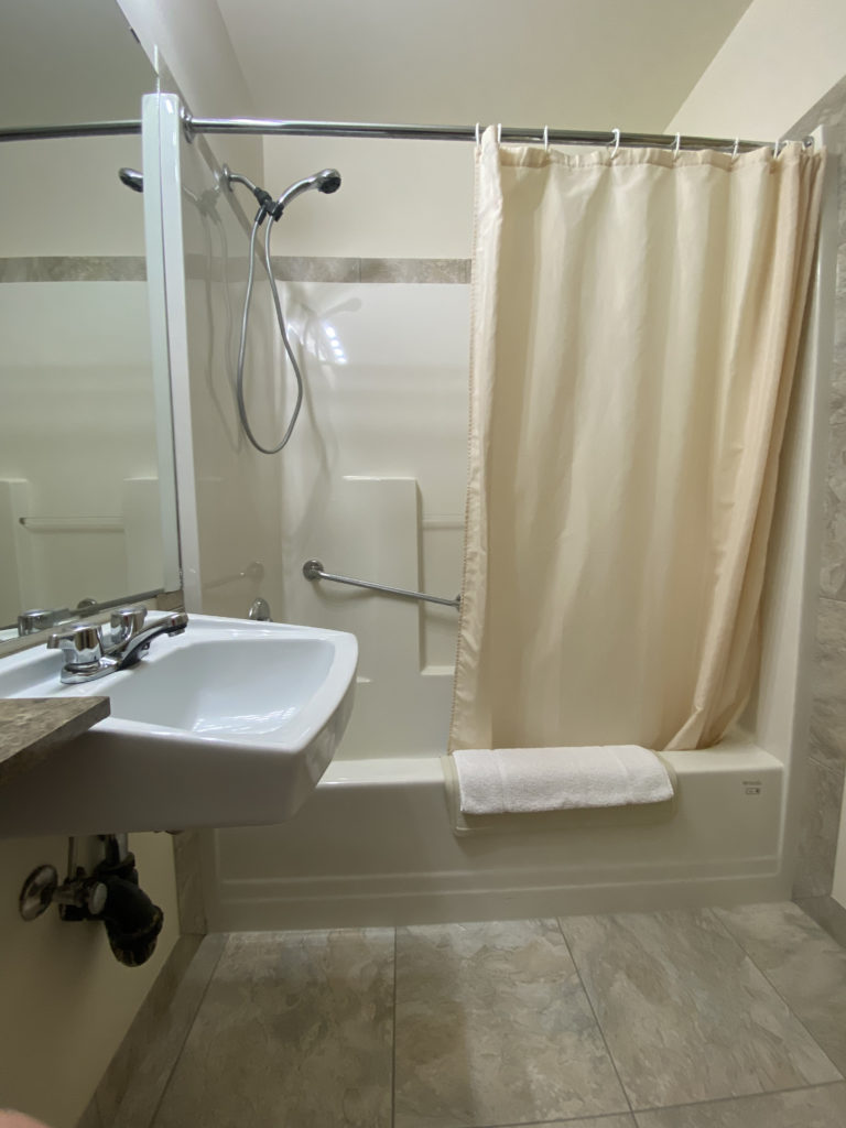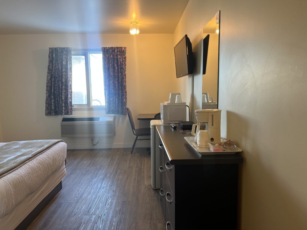 This room has a single queen-size bed, comfortable seating to relax and a table and chairs to get caught up on emails or enjoy your dinner. All rooms come with in room climate control, a HD flat screen TV, mini refrigerator, microwave, coffee maker, no charge Wi-Fi, and bathtub with shower.